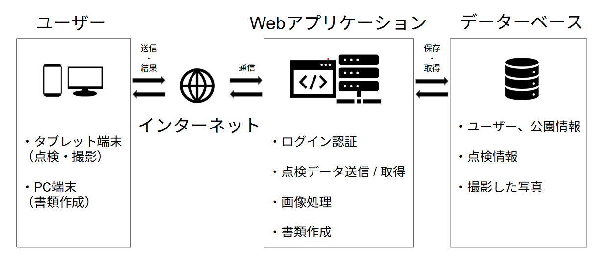 本システムは、横浜市の公園遊具点検業務の効率化を目的としている。