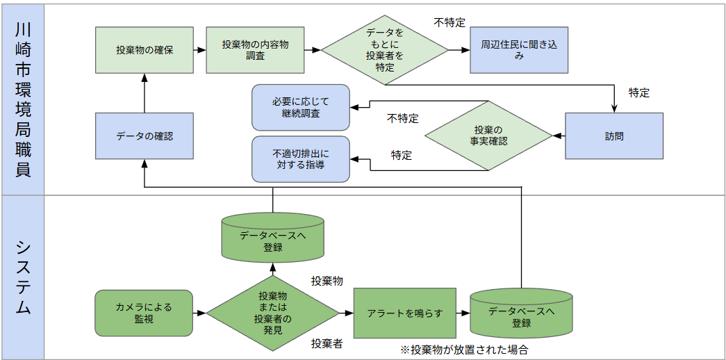 茅ヶ崎市では、年間おおよそ100件から200件近く不法投棄があり、対策としては、早期の発見、情報提供・共有、パトロールや監視カメラの設置が重要である。本プロジェクトではそのような状況を踏まえ、茅ヶ崎市環境部環境事業センターを想定クライアントとして、情報提供・共有の迅速化や、パトロールや監視カメラの設置といった監視活動の効率化などの観点から不法投棄対応を支援するシステムを開発する。