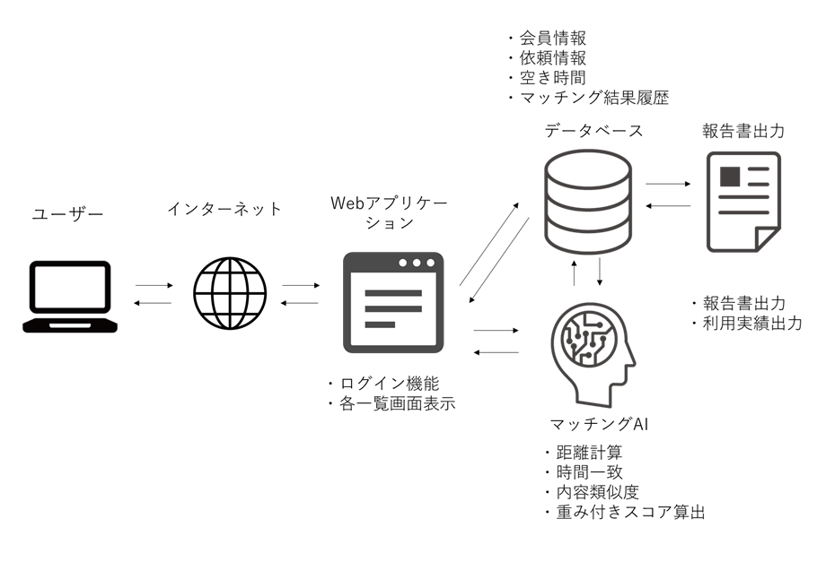 本システムは、会員登録、マッチング、カレンダーによる空き状況の共有、活動履歴の管理、報告書出力などの業務を一元化し、職員が迅速かつ正確に業務を進められるようにすることを目的としている。