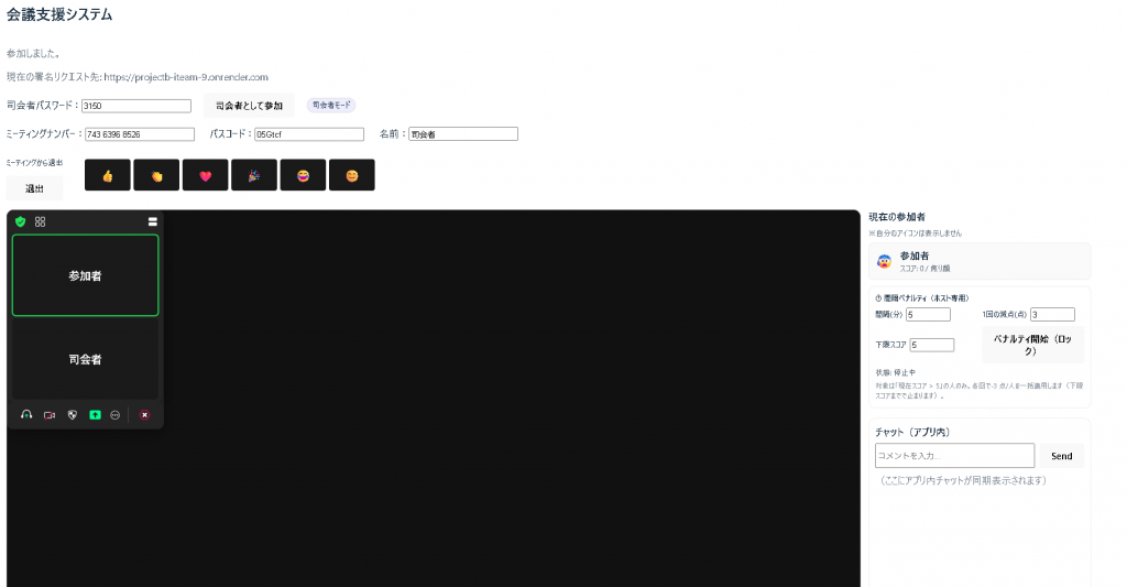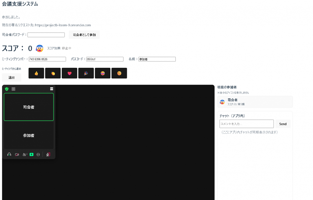 参加者は、参加者自身のスコア(数値)とそれに対応して変化する顔文字、そして自分以外の参加者の顔文字の一覧をリアルタイムで確認することで、その会議において自分がどれだけアクションを起こしたか、それが他の参加者と比べてどの程度であるかを知ることができます。その機能によって、参加者自身が会議への参加姿勢の見直しや改善を行うきっかけを与え、会議へのより意欲的な参加を促します。