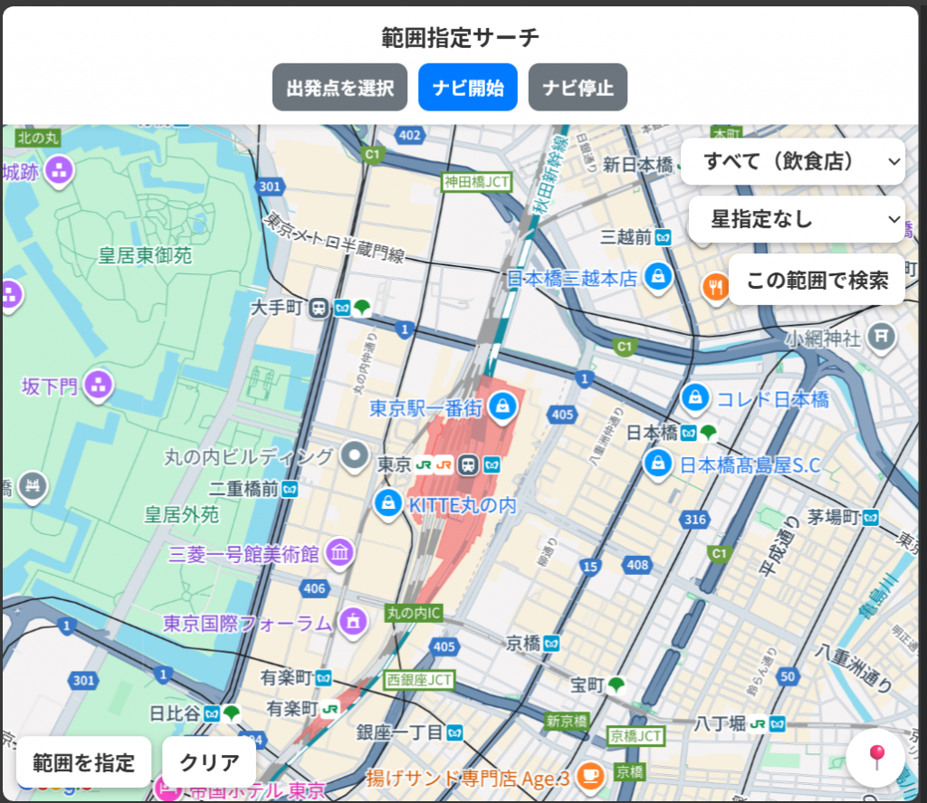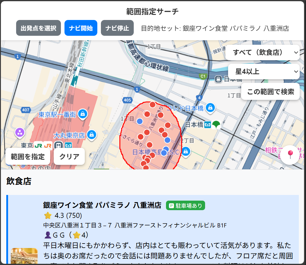 地図上で任意の領域を指定し、その範囲内の飲食店・駐車場を正確に検索できるシステムを完成させる。