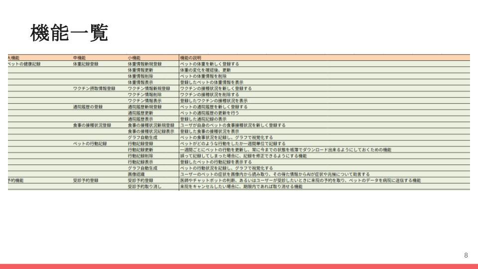 具体的な機能は3つあり、まず1つ目は、健康管理の可視化機能である。飼い主が入力した体重・食事・行動などの日々の記録を自動でグラフ化し、健康状態を視覚的に管理可能にする。また、獣医師への情報共有が可能になるため問診の効率・診断の精度の向上につながる。2つ目は、AI画像認識機能である。ペットの皮膚などの画像をAIが分析し、健康状態を予測、受診の必要性を判定し飼い主にアドバイスを行う機能である。3つ目は診療予約機能で、システム上から来院予約を可能にすることで、電話対応の削減とスムーズな受診可能にする。