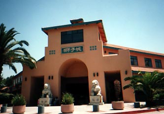 建物は全体がオレンジで色づけされている。屋根の下などに青緑色のストライプが塗られていて、脇の椰子の木と解け合っている。入り口前には、狛犬のように対象にならんだ二匹の白いライオンの石像が。そして門には「獅子城」と感じで書かれていた。