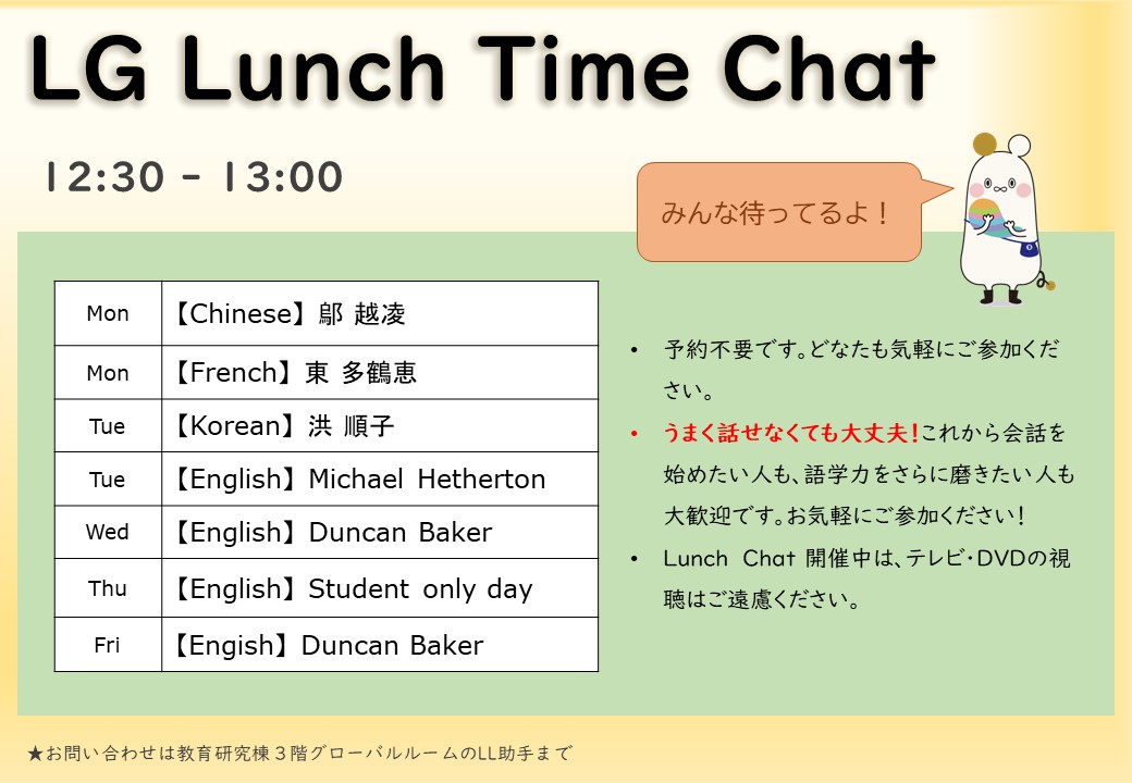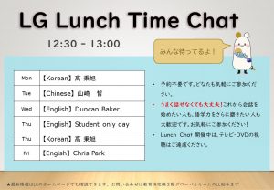 LG Lunch Time Chat(ランチタイム英会話) 2025.9.27更新 ~秋学期は9月29日からスタートします~ ランチタイムに、英語のネイティブスピーカーの先生がいらっしゃいます。 英語で楽しくお話ししましょう! 火~金曜日のお昼休みにLanguage Garden内で開催しています。 月曜日は中国語チャット、フランス語チャット、火曜日は韓国語チャットもあります! 各言語の先生がいらっしゃいます。 奮ってご参加お待ちしています!!